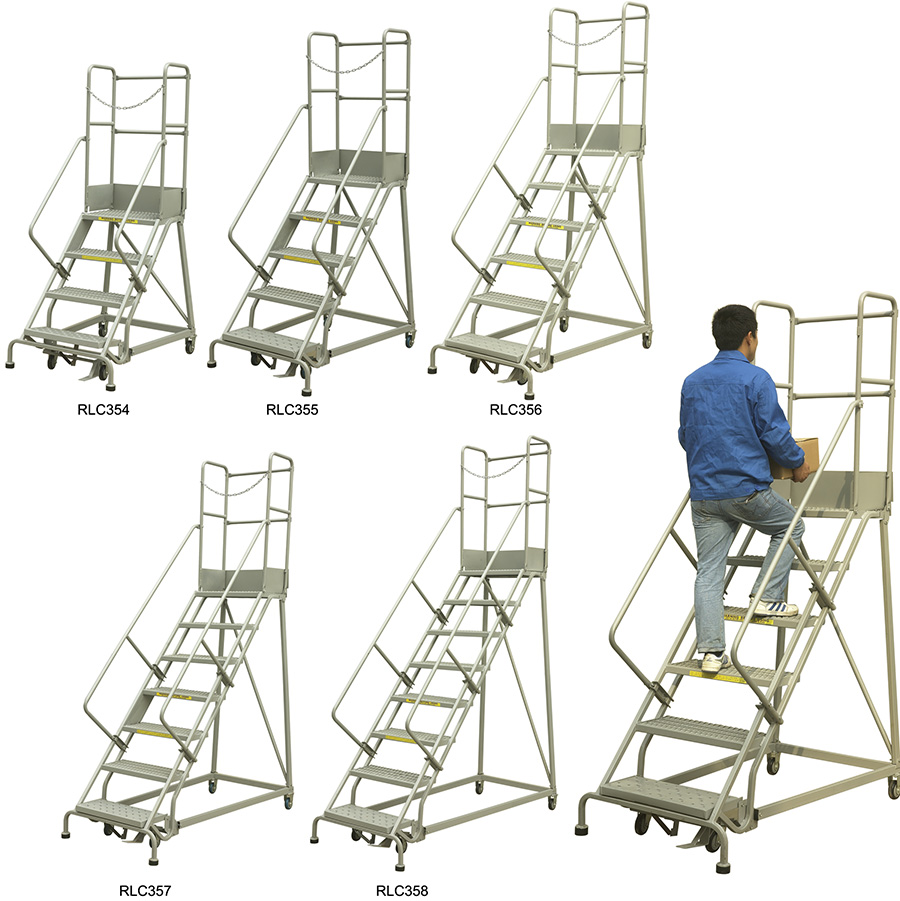 ● 優客力配置踏板鎖定機構,踩壓底部踏板可自動固定梯子;踩壓底部踏板下方的解除鎖定壓桿,便可輕松移動取貨梯。